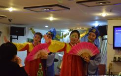 メニューも中華メインだが、配膳するスタッフが、なぜか艶やかなチマチョゴリを着た北朝鮮人女性で、平壌冷麺や大同江ビールがあり、ステージショーもある。