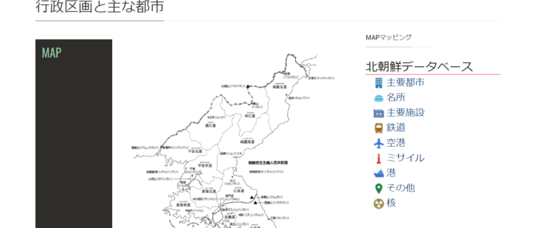 もう1つは、「地図」です。「北朝鮮マップ」は、北朝鮮の主要都市や施設、名所、空港、港、ミサイル関連施設、核施設などをそれぞれのマークでグーグルマップ上に表示させています。今後、アクセスするたびにドンドン充実していく予定です。