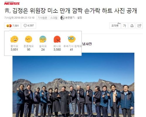 だが、翌19日の「平壌合同宣言 金正恩が警護の心配にもかかわらず答礼訪問、北指導者初めてソウルへ」では、いいねのクリック数がイライラを逆転。20日の「文大統領・金委員長、白頭山天地をともに散策」、23日の「青瓦台、金正恩委員長 笑顔満開びっくり指ハート写真公開」でも、肯定的な評価をする人がグンと増えた。肯定的なコメントは次のようなものだ。