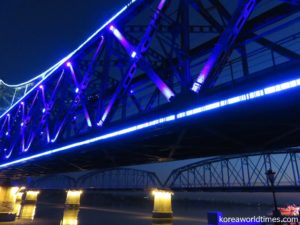 夜間は中国側のみライトアップされる中朝国境の鉄橋