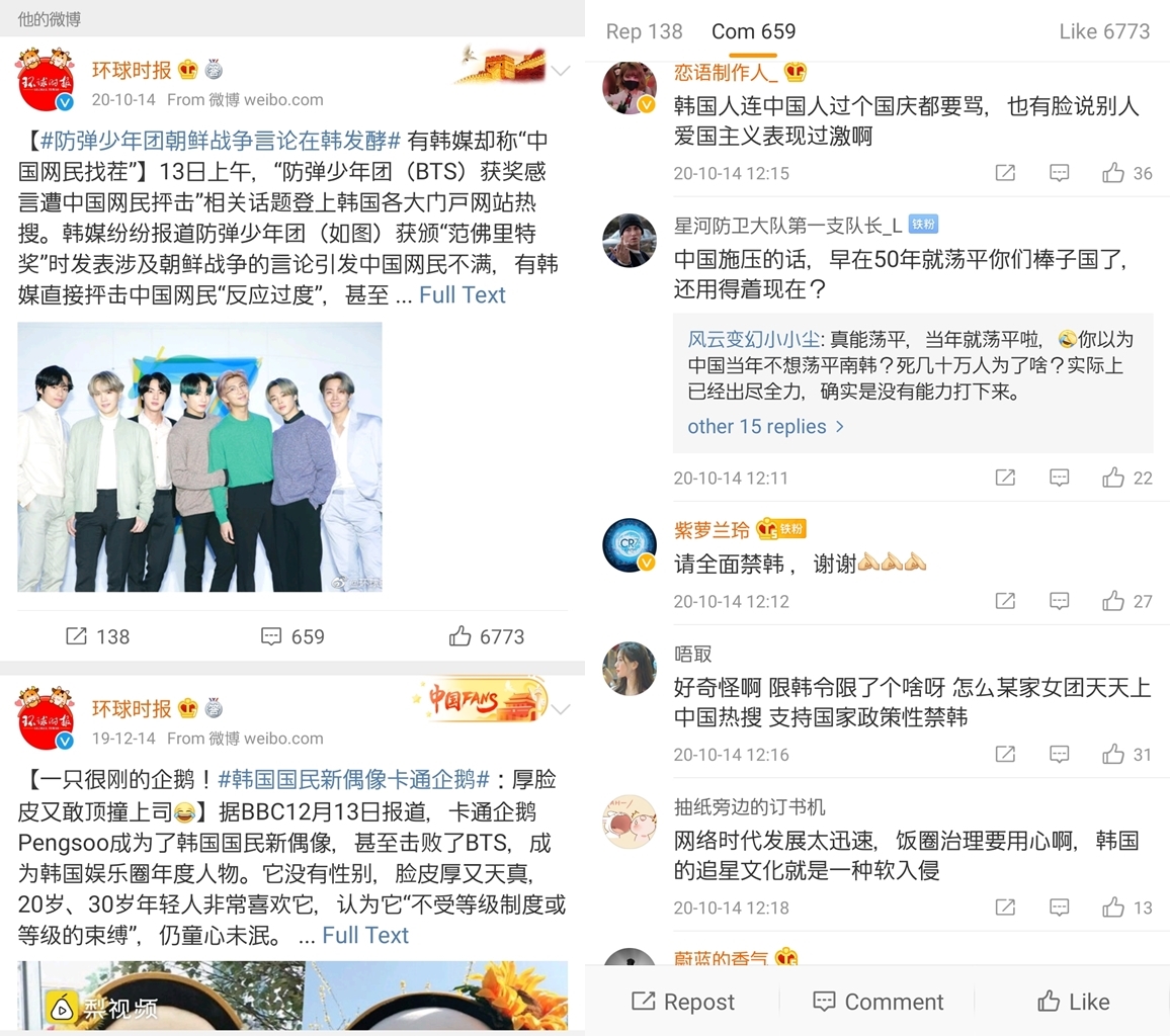 10月14日、環球時報がBTSを非難する投稿は、現在も確認できる。ちょうど10月25日(朝鮮戦争への正式参戦日)直前だったので、もっと愛国心を喚起するように中央政府から至上命題が与えられていたと推測できる時期だ。